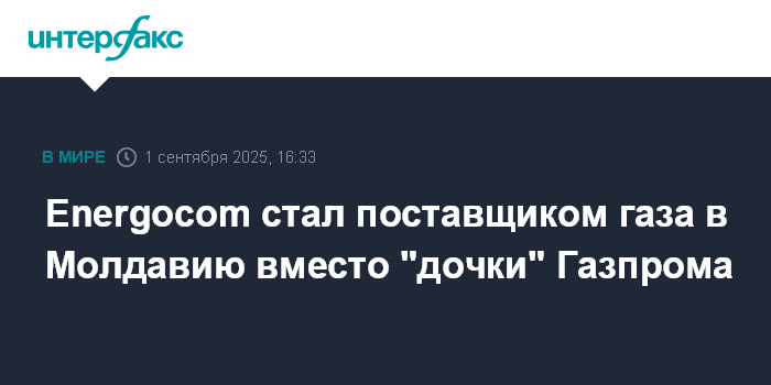 Москва. 1 сентября. INTERFAX.RU - Молдавское госпредприятие Energocom с 1 сентября официально стало поставщиком природного газа в стране в рамках обязательства по предоставлению коммунальных услуг и гарантийного снабжения вместо АО "Молдовагаз" ("Газпром" контролирует более 60% акций), сообщил Energocom.