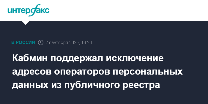 Москва. 2 сентября. INTERFAX.RU - Правительство поддержало депутатский законопроект, предлагающий убрать из общедоступной части реестра операторов персональных данных Роскомнадзора адреса физических лиц и индивидуальных предпринимателей.