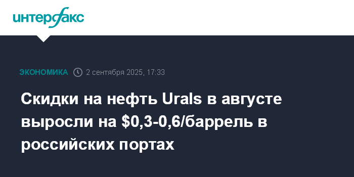 Москва. 2 сентября. INTERFAX.RU - Скидки на российскую нефть Urals в российских портах по итогам августа выросли к уровню июля на $0,3-0,6 за баррель, премии в Китае снизились на $0,7 за баррель, свидетельствуют данные Argus, с которыми ознакомился "Интерфакс".