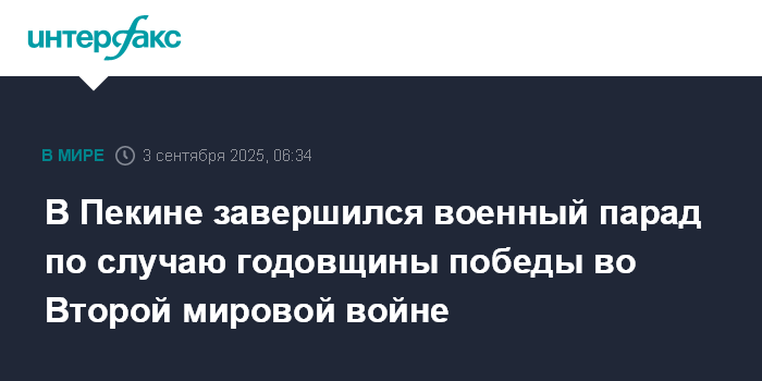 Москва. 3 сентября. INTERFAX.RU - В Пекине прошел военный парад, посвященный 80-й годовщине победы над японскими милитаристами и во Второй мировой войне, в нем приняли участие около 40 тыс. военнослужащих и почти 500 образцов боевой техники.