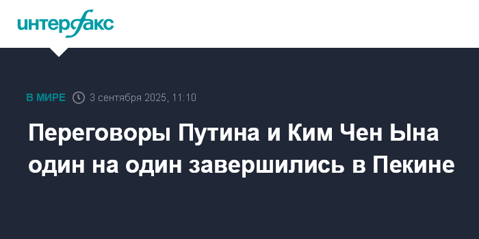 Москва. 3 сентября. INTERFAX.RU - Президент РФ Владимир Путин и глава КНДР Ким Чен Ын завершили переговоры тет-а-тет в Пекине, их беседа длилась около часа
