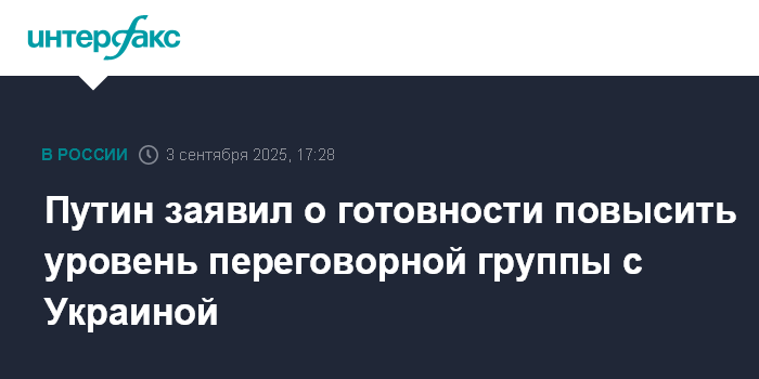 Москва. 3 сентября. INTERFAX.RU - Россия готова повысить уровень делегации на переговорах с Украиной, заявил президент РФ Владимир Путин.