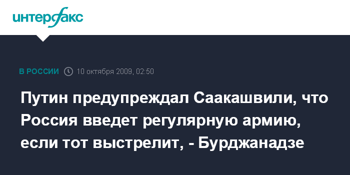 "Саакашвили виноват, что знал о том, что происходило в грузино-российских отношениях в последнее время. Он виноват и потому, что Путин ему прямо сказал, что "если ты выстрелишь, я введу регулярную армию". И, несмотря на это, М.Саакашвили поверил словам своего окружения, что "у русских ржавые танки и за ночь мы возьмем Цхинвали". Власти Грузии должны понести за это ответственность", - заявила в пятницу вечером Н.Бурджанадзе в эфире грузинской телекомпании "Рустави-2" в ходе политического ток-шоу "Позиция". При этом она отметила, что была свидетелем телефонного разговора В.Путина и М.Саакашвили еще в апреле 2008 года.