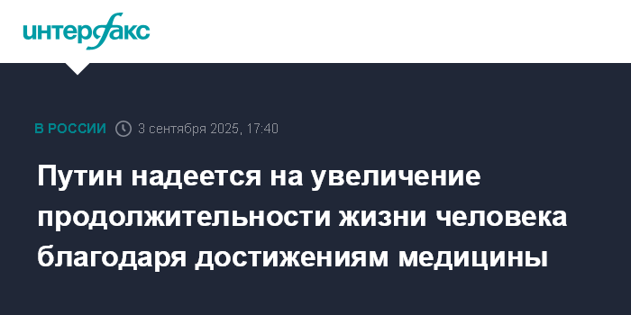 Москва. 3 сентября. INTERFAX.RU - Президент РФ Владимир Путин допускает, что благодаря новейшим достижениям медицины, продолжительность жизни человека может существенно увеличиться по сравнению с нынешней.