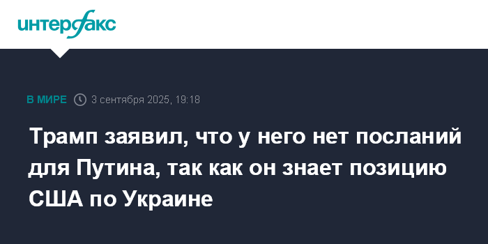 Москва. 3 сентября. INTERFAX.RU - Президент США Дональд Трамп заявил, что президент РФ Владимир Путин знаком с его позицией по украинскому урегулированию, и не пожелал добавить что-либо к этому.