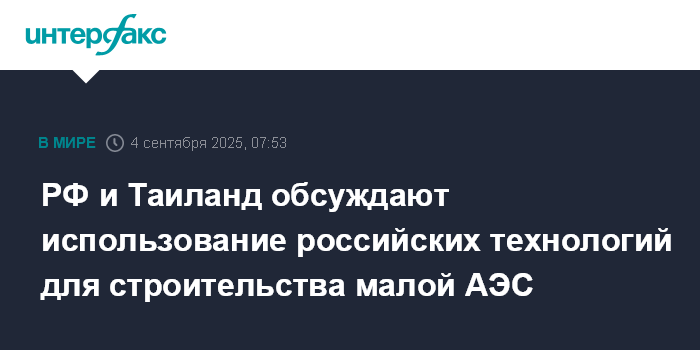 Москва. 4 сентября. INTERFAX.RU - Россия и Таиланд обсуждают возможность использования российских технологий для строительства первой в стране малой АЭС, сообщил гендиректор "Росатом - международная сеть" Вадим Титов в рамках ВЭФ-2025.