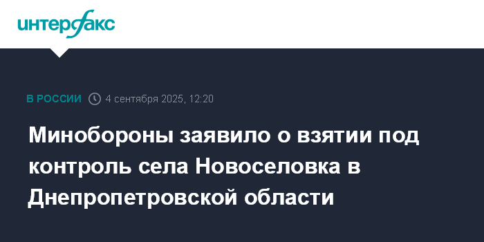 Москва. 4 сентября. INTERFAX.RU - Министерство обороны РФ заявило, что под контроль российской армии перешел населенный пункт Новоселовка в Днепропетровской области.