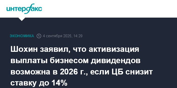 Шохин заявил, что активизация выплаты бизнесом дивидендов возможна в 2026 г., если ЦБ снизит ставку до 14%