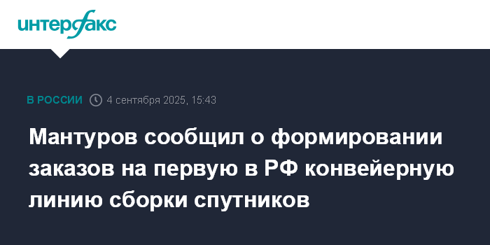 Москва. 4 сентября. INTERFAX.RU - Идет работа по формированию заказов под загрузку первой в России конвейерной линии сборки спутников на предприятии "Решетнев", сообщил первый вице-премьер РФ Денис Мантуров.