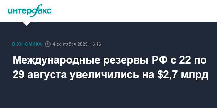 Международные резервы РФ с 22 по 29 августа увеличились на $2,7 млрд