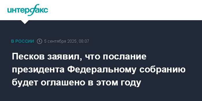 Москва. 5 сентября. INTERFAX.RU - Послание президента РФ Владимира Путина Федеральному собранию в этом году состоится, но пока его дата не определена, заявил пресс-секретарь российского лидера Дмитрий Песков.