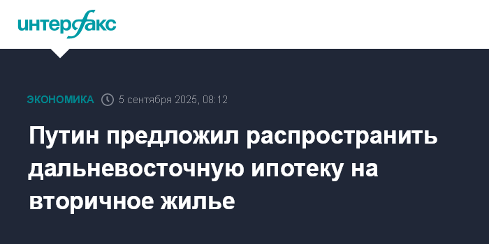 Москва. 5 сентября. INTERFAX.RU - Президент РФ Владимир Путин предложил распространить дальневосточную ипотеку под 2% на вторичное жилье.