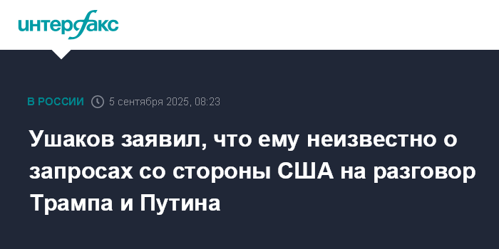 Москва. 5 сентября. INTERFAX.RU - Помощнику президента РФ Юрию Ушакову неизвестно о запросах со стороны США о разговоре американского и российского лидеров Дональда Трампа и Владимира Путина.