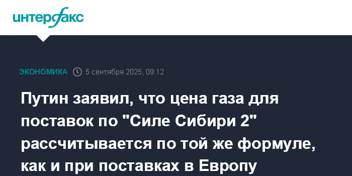 Москва. 5 сентября. INTERFAX.RU - Цена поставок газа по новому газопроводу "Сила Сибири 2" рассчитывается по такой же формуле, как при поставках газа в Европу, заявил президент РФ Владимир Путин в ходе пленарного заседания ВЭФ.