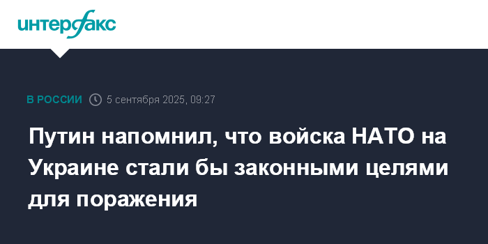 Москва. 5 сентября. INTERFAX.RU - Если на Украине появятся воинские контингенты НАТО, это будут законные цели для поражения, заявил президент РФ Владимир Путин.