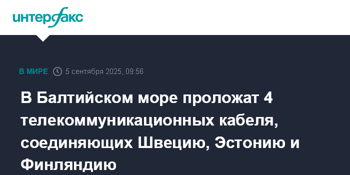 Москва. 5 сентября. INTERFAX.RU - Компания GlobalConnect, поставщик цифровой инфраструктуры, запустила проект строительства четырех новых подводных кабельных систем в Балтийском море, соединяющих Швецию, Эстонию и Финляндию, пишет в пятницу портал Yle со ссылкой на финское агентство новостей STT.