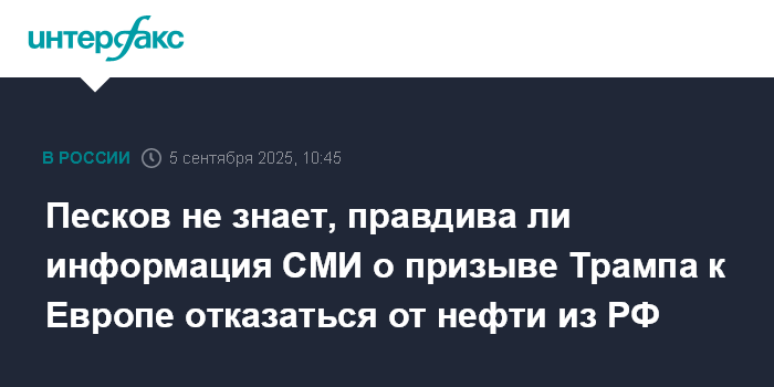 Песков не знает, правдива ли информация СМИ о призыве Трампа к Европе отказаться от нефти из РФ