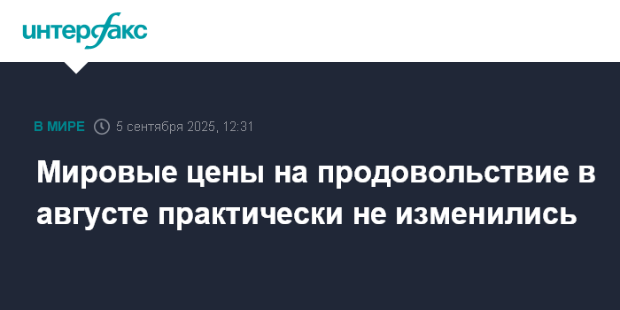 Москва. 5 сентября. INTERFAX.RU - Мировые цены на продовольствие в августе по сравнению с июлем практически не изменились: их индекс составил 130,1 пункта против пересмотренного за июль значения в 130 пунктов, сообщается в ежемесячном обзоре ФАО (продовольственная и сельскохозяйственная организация ООН).
