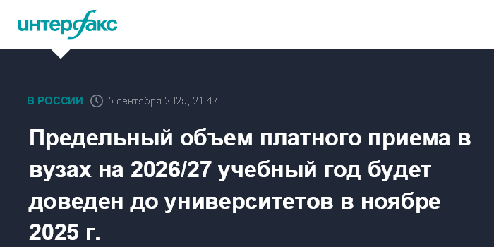 Предельный объем платного приема в вузах на 2026/27 учебный год будет доведен до университетов в ноябре 2025 г.