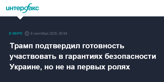 Москва. 6 сентября. INTERFAX.RU - США согласны внести свой вклад в гарантии безопасности Украине, однако не будут выполнять ведущие роли, заявил в пятницу американский президент Дональд Трамп.