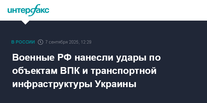 Москва. 7 сентября. INTERFAX.RU - Российские военные сообщили, что нанесены удары по объектам военно-промышленного комплекса и транспортной инфраструктуры Украины, используемым в интересах ВСУ, складам вооружения и аэродромам ВСУ.