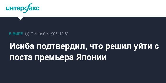 Москва. 7 сентября. INTERFAX.RU - Сигэру Исиба подтвердил, что решил уйти с должностей премьер-министра Японии и лидера Либерально-демократической партии (ЛДП) и пояснил, что не сделал этого раньше из-за необходимости урегулировать ситуацию с пошлинами США.