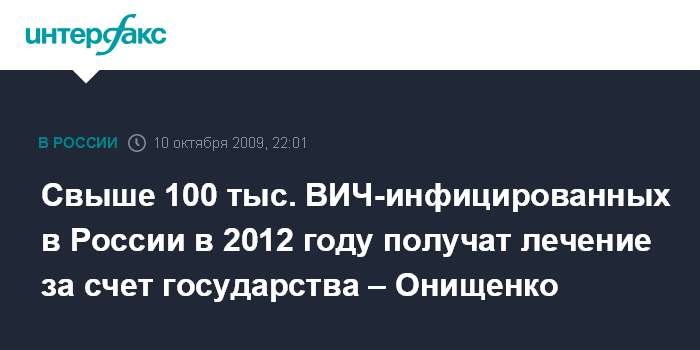 Москва. 10 октября. ИНТЕРФАКС - Более 100 тыс. ВИЧ-инфицированных в России в 2012 году будут лечиться за счет государства, заявил руководитель Роспотребнадзора, главный государственный санитарный врач РФ Геннадий Онищенко.
