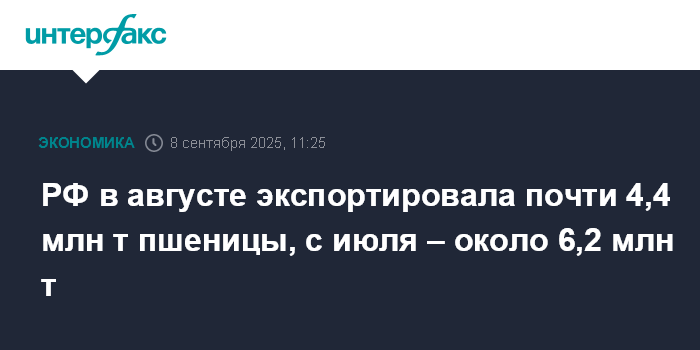 "По итогам августа экспорт пшеницы составил почти 4,4 млн тонн. С начала сезона (с июля 2025 года - ИФ) вывоз пшеницы достиг около 6,2 млн тонн", - сообщили "Интерфаксу" в аналитическом центре "Русагротранса".