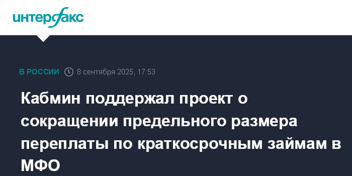 Москва. 8 сентября. INTERFAX.RU - Правительство РФ поддержало законопроект, который ограничивает переплату по краткосрочным (до года) потребительским займам МФО, снижая ее максимальный размер со 130% до 100% суммы долга.