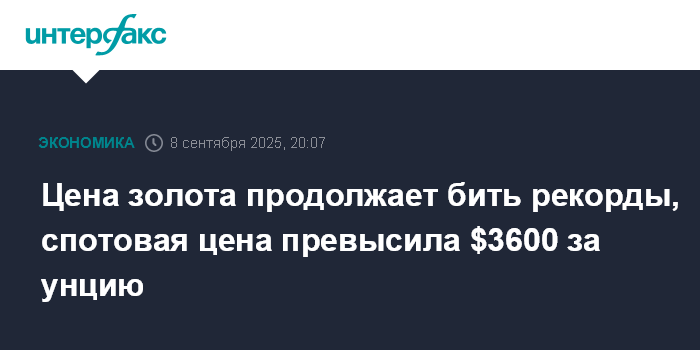 Цена золота продолжает бить рекорды, спотовая цена превысила $3600 за унцию