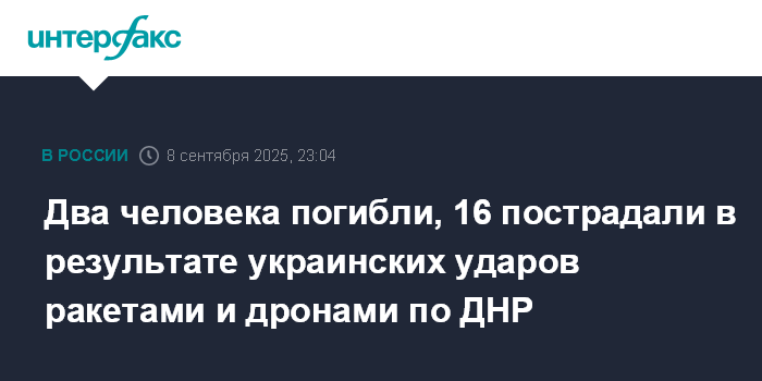 Москва. 8 сентября. INTERFAX.RU - Двое мирных жителей погибли, еще 16 пострадали в результате ударов по Донецкой Народной Республике в понедельник, сообщил глава региона Денис Пушилин.