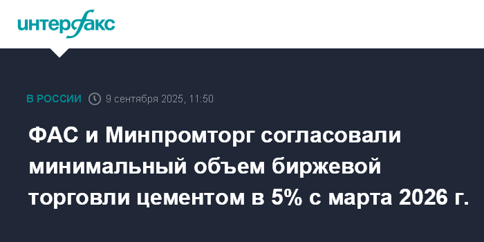 Москва. 9 сентября. INTERFAX.RU - Минимальный объем продажи цемента в РФ в рамках биржевой торговли с 1 марта 2026 года, как ожидается, составит 5% от среднеарифметического объема реализации за последние три года года в каждый конкретный месяц. Проект соответствующего приказа совместно подготовлен Федеральной антимонопольной службой (ФАС) и Минпромторгом РФ.