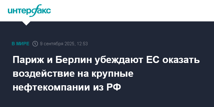 Москва. 9 сентября. INTERFAX.RU - Франция и Германия предлагают ЕС ввести ограничения в отношении крупных нефтяных компаний РФ в рамках готовящегося 19-го санкционного пакета, передает во вторник Bloomberg со ссылкой на документы, оказавшиеся в распоряжении агентства