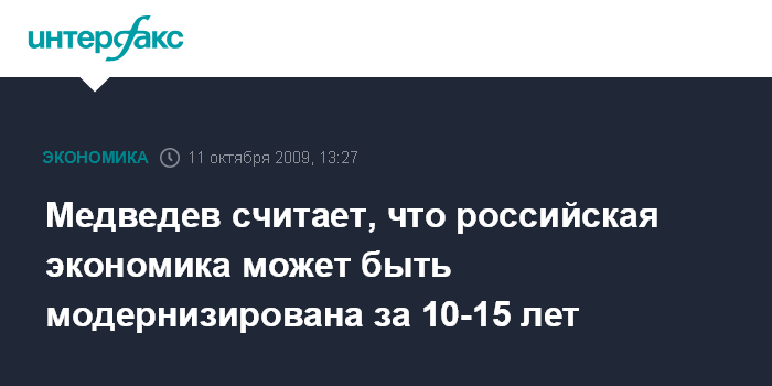 Москва. 11 октября. INTERFAX.RU - Президент РФ Дмитрий Медведев считает, что Россия может модернизировать экономику и сделать ее конкурентоспособной в течение 10-15 лет.