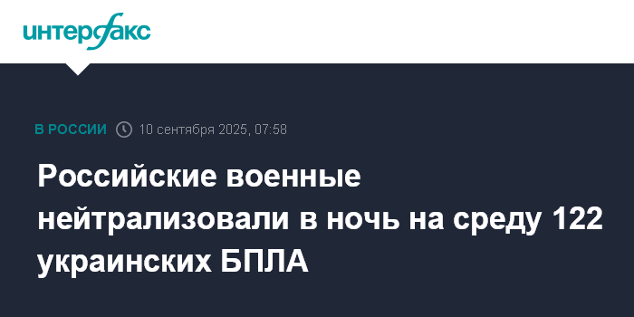 Москва. 10 сентября. INTERFAX.RU - Минобороны РФ заявило, что с полуночи до 5:00 среды над 13 российскими регионами и Черным морем было перехвачено и уничтожено 122 украинских беспилотника.