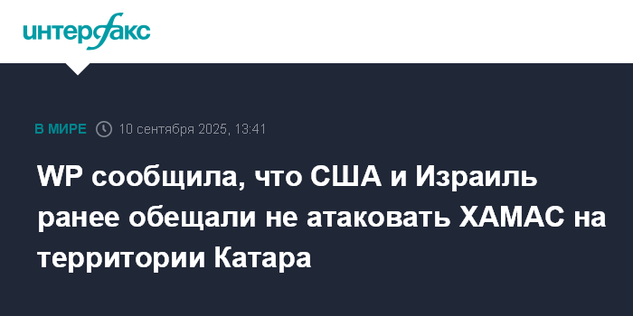 Москва. 10 сентября. INTERFAX.RU - США и Израиль ранее давали обещание Дохе, что будут избегать ударов по представителям движения ХАМАС, которые находятся в Катаре, сообщила в среду газета The Washington Post со ссылкой на источники.