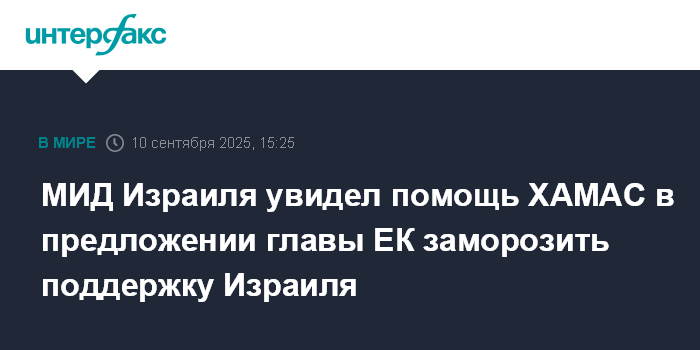Ранее 10 сентября фон дер Ляйен предложила приостановить поддержку Израиля со стороны ЕС ввиду кризиса в секторе Газа. "Дальнейшие меры: заморозить поддержку Израиля, не затрагивая гражданское общество (...) и частично приостановить соглашение о свободной торговле", - написала она в соцсети X.
