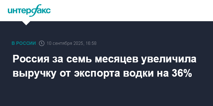 Москва. 10 сентября. INTERFAX.RU - Выручка России от экспорта водки за семь месяцев 2025 года превысила $31 млн, что на 36% больше, чем за аналогичный период прошлого года, сообщает федеральный центр "Агроэкспорт" со ссылкой на оценки экспертов.
