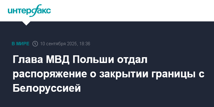 Москва. 10 сентября. INTERFAX.RU - Глава МВД Польши подписал распоряжение о закрытии границы с Белоруссией до дальнейшего уведомления, сообщила в среду пресс-служба ведомства.