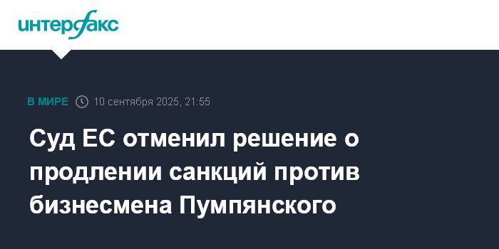 Москва. 10 сентября. INTERFAX.RU - Суд ЕС в среду постановил отменить принятое ранее в этом году решение о продлении европейских санкций против российского бизнесмена Дмитрия Пумпянского.