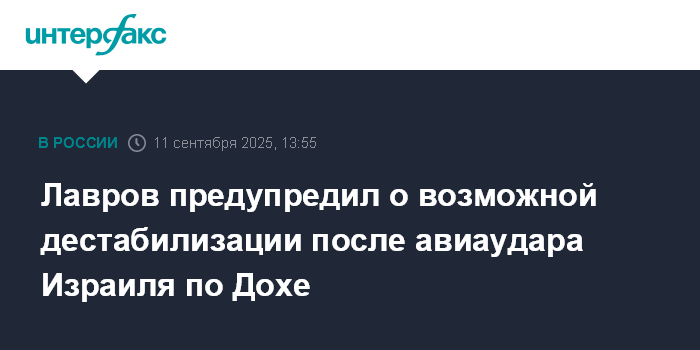 Москва. 11 сентября. INTERFAX.RU - Удар Израиля по руководству движения ХАМАС в Дохе чреват дальнейшей дестабилизацией обстановки на Ближнем Востоке, заявил глава МИД Сергей Лавров на заседании Стратегического диалога Россия - Совет сотрудничества арабских стран Персидского залива.