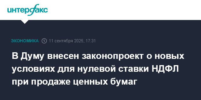 Москва. 11 сентября. INTERFAX.RU - В Госдуму внесен законопроект, который меняет условия применения нулевой ставки НДФЛ при продаже ценных бумаг, находящихся во владении у инвестора более пяти лет, также предлагается упростить продажу акций высокотехнологичного сектора российской экономики.