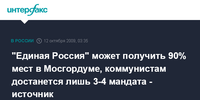 Москва. 12 октября. ИНТЕРФАКС-МОСКВА - Партия "Единая Россия" в условиях нынешнего расклада итогов голосования по выборам депутатов Мосгордумы пятого созыва сможет получить в столичном парламенте 90% депутатских мест, сообщил "Интерфаксу" в понедельник источник в Мосгордуме.