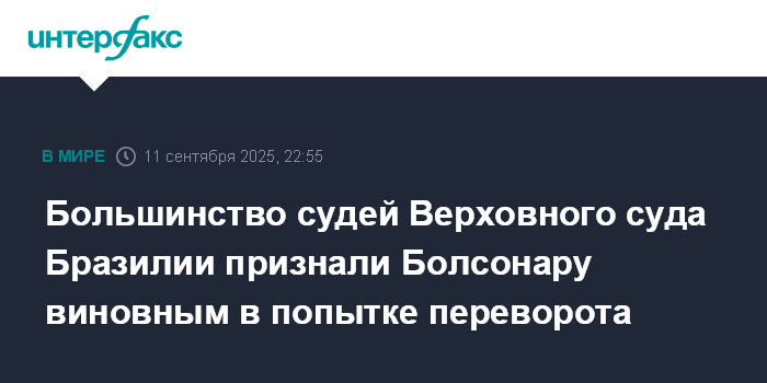 Москва. 11 сентября. INTERFAX.RU - Большинство судей Верховного суда Бразилии поддержали признание бывшего президента страны Жаира Болсонару виновным в попытке госпереворота после выборов 2022 года, сообщает агентство ЭФЭ.