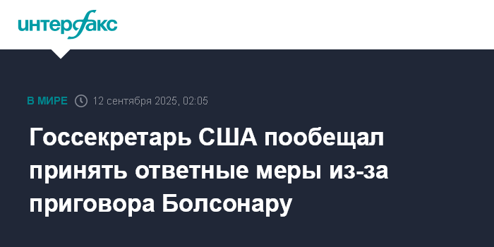Москва. 12 сентября. INTERFAX.RU - Глава Госдепартамента США Марко Рубио заявил, что США отреагируют соответствующим образом в случае признания экс-президента Бразилии Жаира Болсонару виновным по делу о госперевороте.