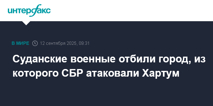 Москва. 12 сентября. INTERFAX.RU - Вооруженные силы Судана и подразделения их союзников выбили Силы быстрого реагирования (СБР) из имеющего стратегическое значение города Бара в провинции Северный Кордофан к западу от Хартума, сообщают региональные СМИ.