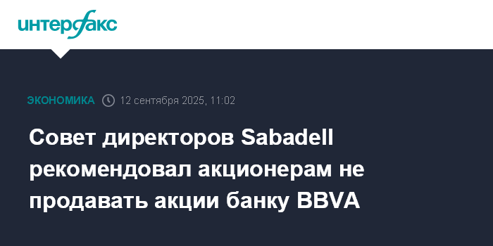 Москва. 12 сентября. INTERFAX.RU - Совет директоров испанского банка Sabadell рекомендовал акционерам не соглашаться на недружественное поглощение и не продавать акции более крупному Banco Bilbao Vizcaya Argentaria (BBVA).