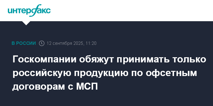 Москва. 12 сентября. INTERFAX.RU - Правительство обяжет крупнейшие госкомпании закупать в рамках офсетных договоров с малым и средним бизнесом (МСП) только российскую продукцию, заявил замначальника отдела методологического обеспечения реализации промполитики департамента стратегического развития и корпоративной политики Минпромторга Вадим Митькин на конференции "Основные тенденции в сфере закупок по закону № 223-ФЗ".