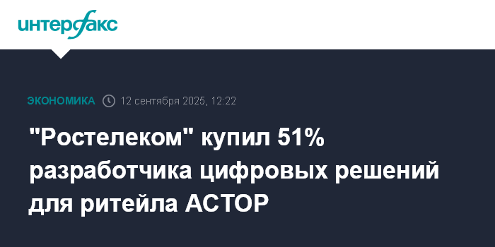 Москва. 12 сентября. INTERFAX.RU - ПАО "Ростелеком" приобрело контроль в разработчике комплексных решений для автоматизации предприятий ритейла АСТОР, сообщил оператор.