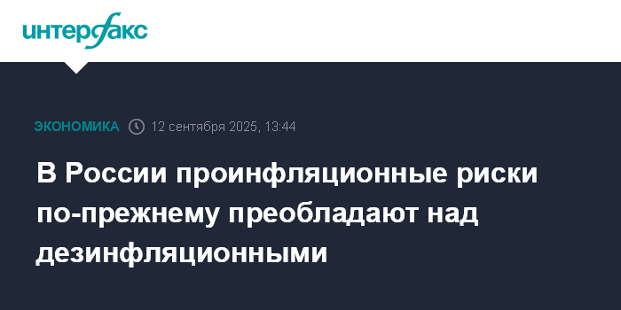 Москва. 12 сентября. INTERFAX.RU - По оценке Банка России, на среднесрочном горизонте проинфляционные риски по-прежнему преобладают над дезинфляционными, говорится в пресс-релизе ЦБ.